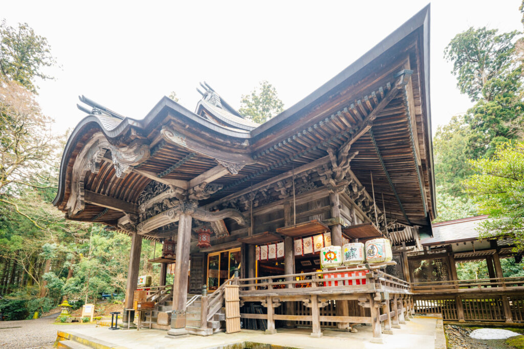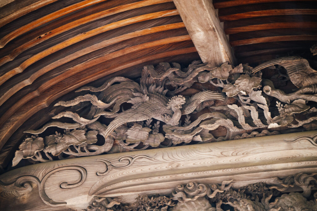 現在の社殿は江戸時代に再建されたもので、その建築には越中井波の棟梁松井角平(まついかくへい)現在も続く(株)松井建設の棟梁が携わり、彫刻も越中井波の岩倉利八らによる緻密な細工が施されています。かつて名工たちが拝殿に施した繊細な彫刻。長い年月を経てもなお美しさを保つ意匠に、1300年の歴史の重みと受け継がれてきた伝統への敬意を感じざるを得ません。