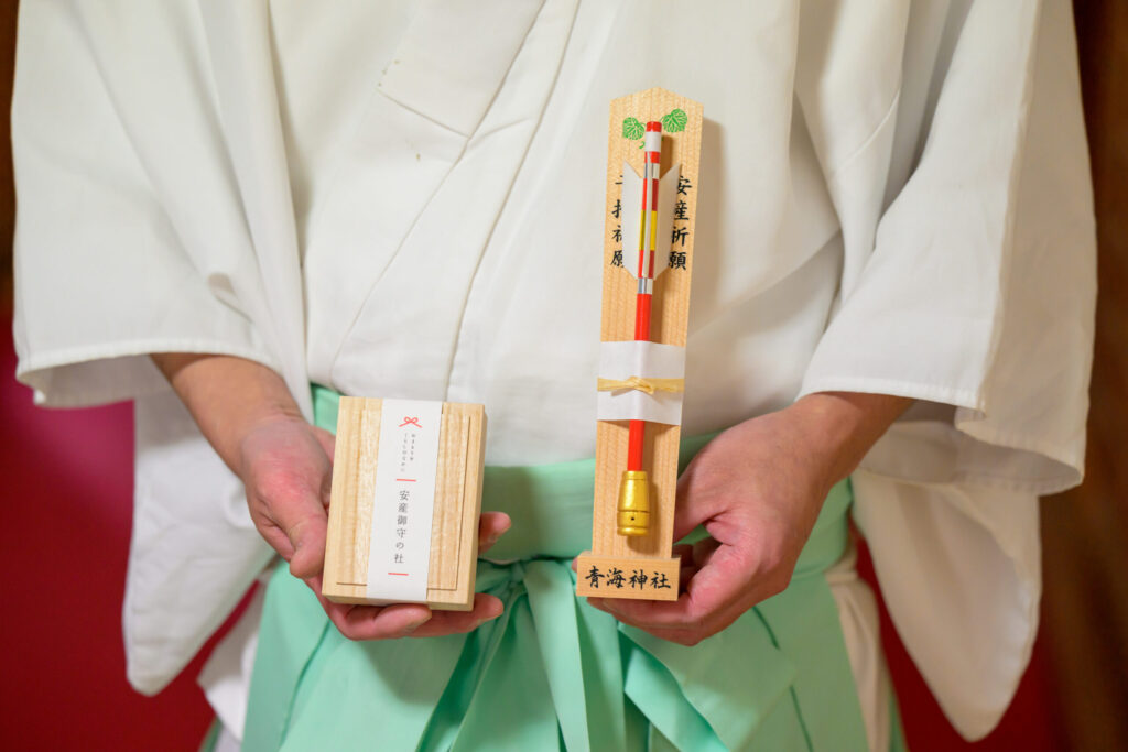 青海神社は、安産や子授けの神としても知られています。その背景にあるのは、美しい「丹塗矢(にぬりのや)」の伝承です。御祭神である玉依姫命が川で遊んでいた際、流れてきた赤い矢を枕元に置いて休んだところ、神の子を身に宿したといわれています。