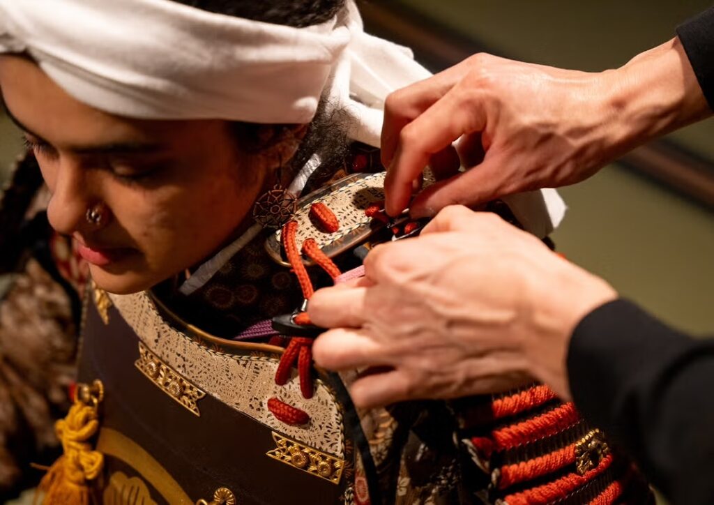そして体験は、武士の正装である甲冑の着付けへと移ります 。ここで使用されるのは、一領20kg前後にもなる本格的な甲冑です 。身に纏った瞬間にずしりとずしりと響く重量感と、兜越しに見える景色。