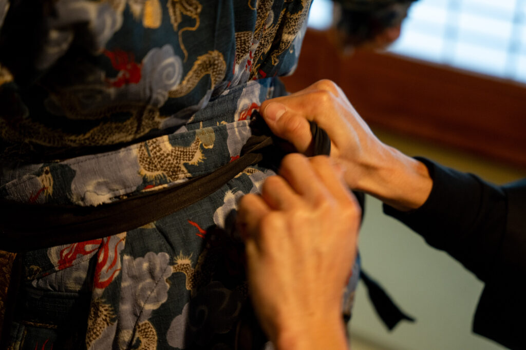 「たっつけ」「たっつけ袴」と呼ばれる、当時の和服を身に纏うところからスタートし、「すね当て」「胴」と一工程ずつ装束を固めていきます。この着用、まさに現代の武士へと生まれ変わる儀式のよう。