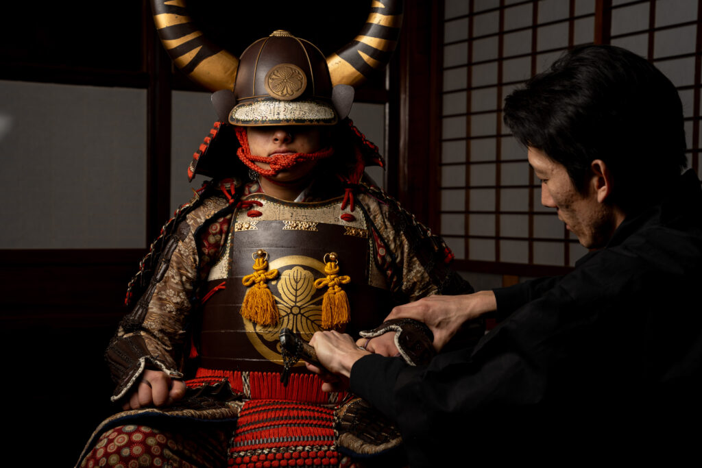 そして体験は、武士の正装である甲冑の着付けへと移ります 。ここで使用されるのは、一領20kg前後にもなる本格的な甲冑です 。身に纏った瞬間にずしりとずしりと響く重量感と、兜越しに見える景色。