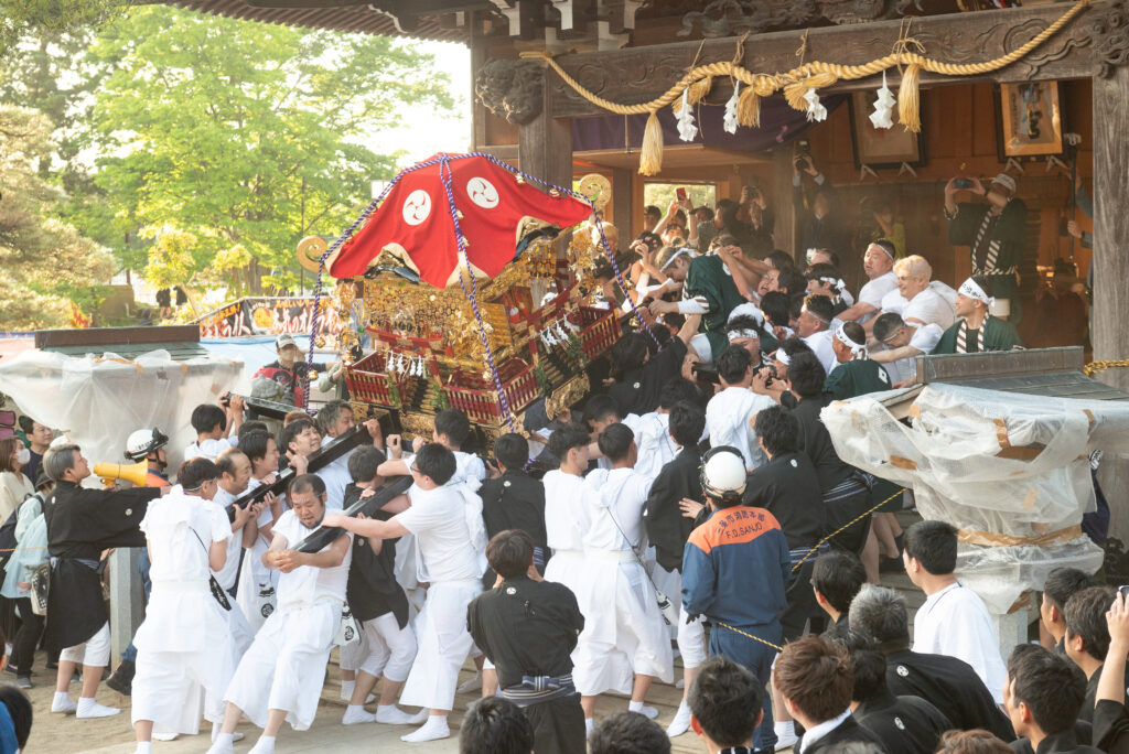 約3時間半の巡行を終え、夕暮れが近づくと、境内は一転して熱狂の渦に包まれます。旅の結びを飾るのは、祭りの最高潮「舞い込み」です。