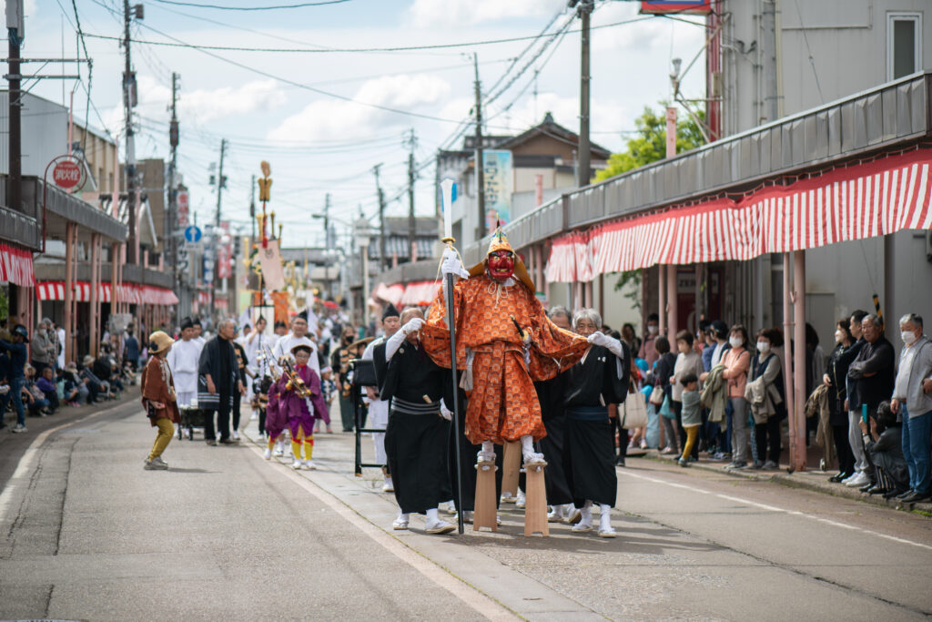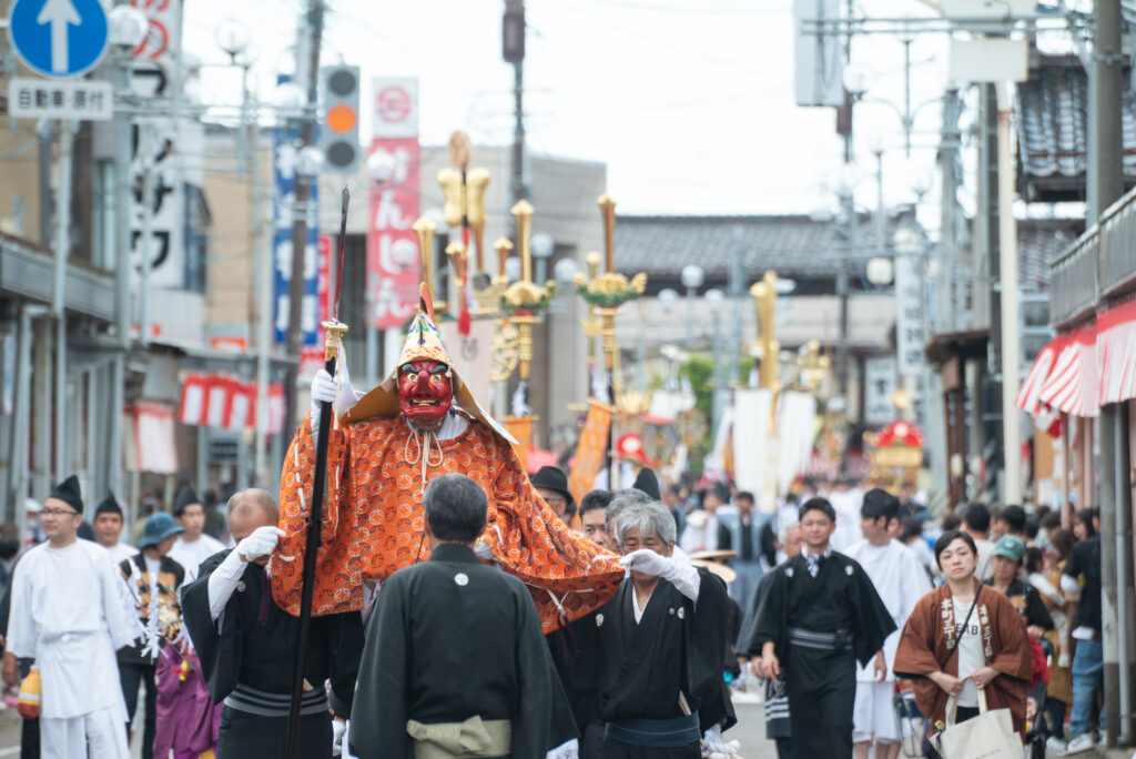 これから行列が来ることを告げる鉄棒(かなぼう)の音が響き、露払が道を清めます。悪魔を払う奴(やっこ)に続き、祭りの象徴である「天狗(導祖神)」が神輿を先導。