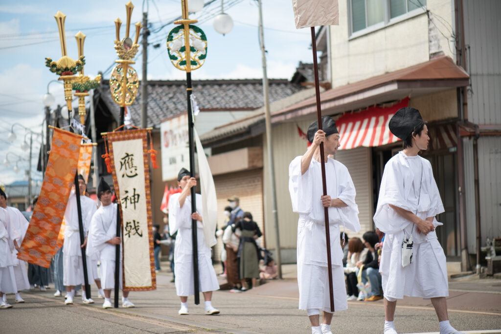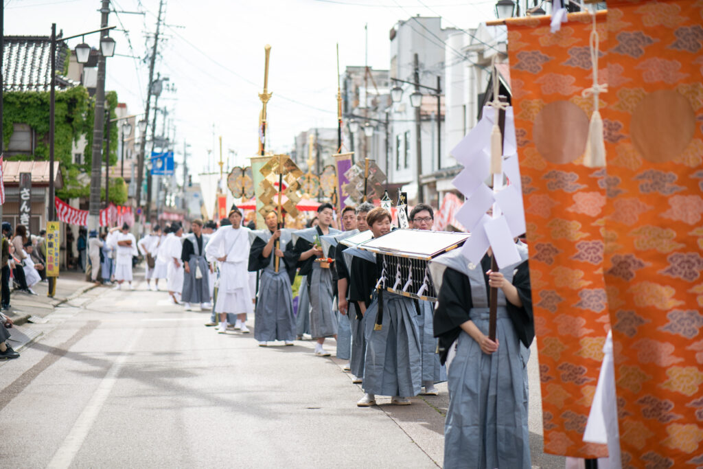 日が沈むと、街は独特の緊張感に包まれます。三条の人々と共に直会(なおらい)を囲み、地元の美酒と食で英気を養った後は、夜の「宵宮(よいみや)神事」へ。翌日の本祭に向けた、厳かな神事で、普段は限られた人しか参加ができません。静まり返った境内に響く祝詞の中、祭りの成功を祈願し、静かな緊張感の中で初日を終えます。夜は、江戸時代の宿場町のころから続く昭和レトロな宿「越前屋ホテル」へ宿泊。