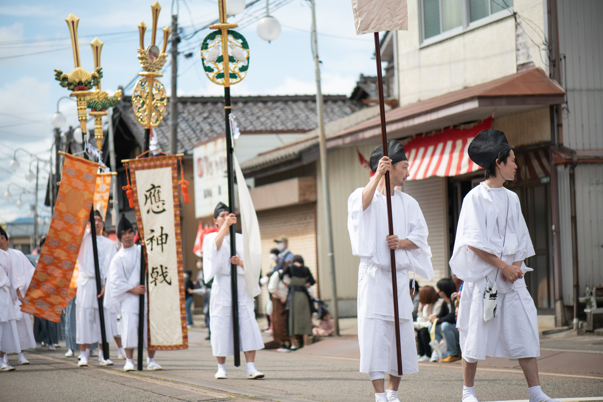 神様が通る道筋で天狗が転ぶことは邪気の現れとされ、「天狗が転ぶと火事になる」という言い伝えがあるほど。行列を横切ることも、上から見下ろすことも許されない――そんな張り詰めた「神域の空気」を全身で感じながら、三条の街を静々と進みます。