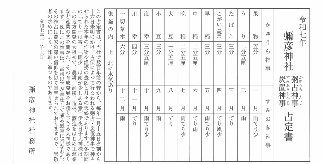 冬の神事『粥占炭置神事(かゆうらすみおきしんじ)』の結果は毎年公表されています